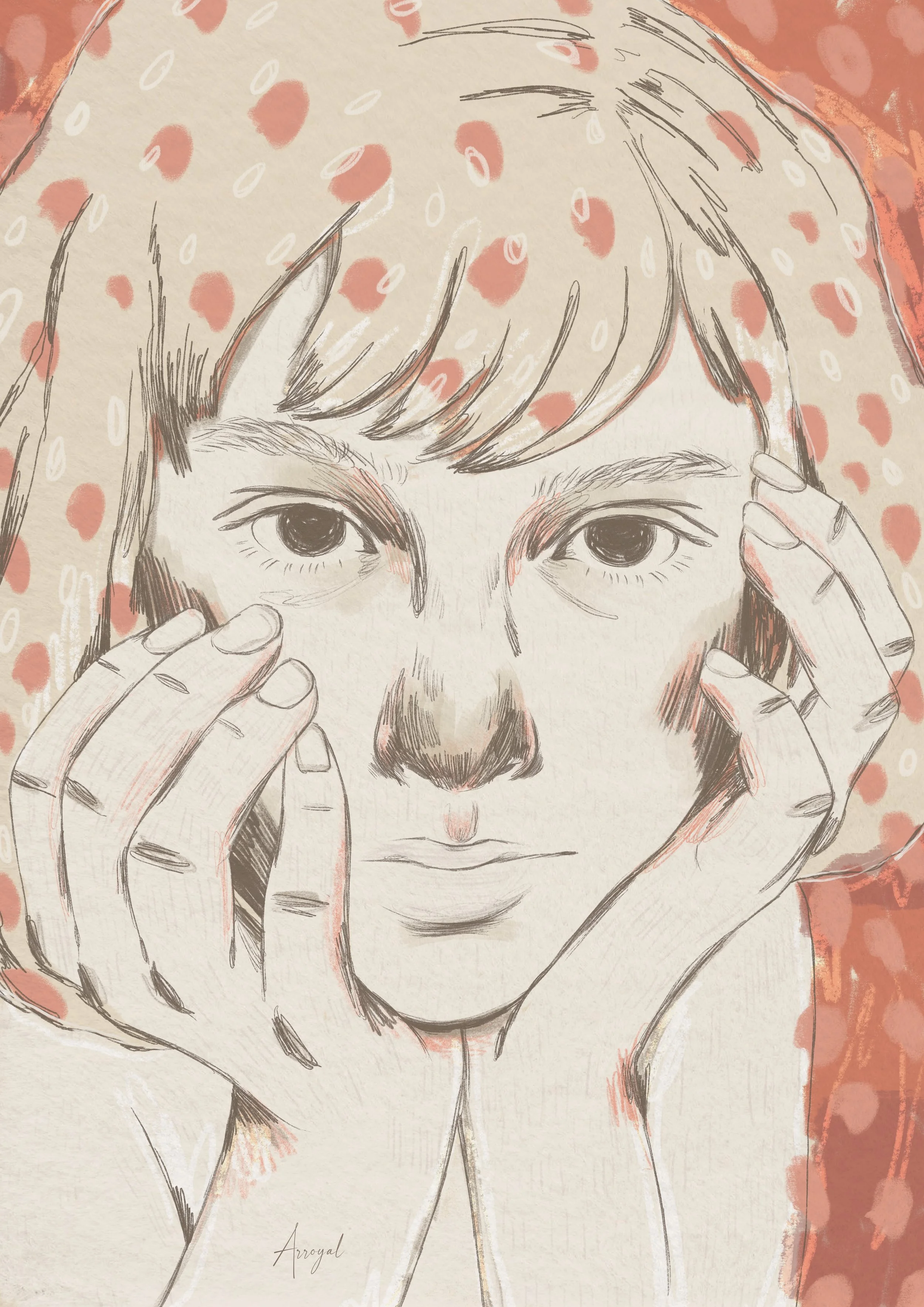 La ilustración juega con la textura y el color para transmitir delicadeza y una emoción serena, manteniendo un equilibrio entre retrato y sensación.